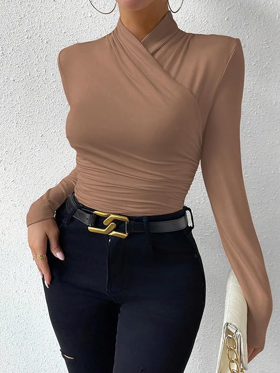 Elevate your wardrobe with the SweatyRocks Ruched Mock Neck Tee. This slim-fitted, long-sleeve top features a stylish mock neck and elegant side ruching for a flattering silhouette. Perfect for layering or wearing solo, its soft, solid-color fabric offers versatile comfort. A chic, essential piece for any modern, sophisticated look..